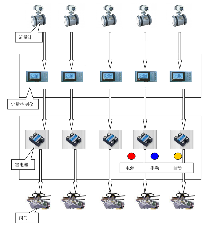 定量控制系統(tǒng)主要由以下三部分組成:流量計(jì)、信號(hào)轉(zhuǎn)換系統(tǒng)及最終控制器組成,其控制的基本原理為:當(dāng)流量計(jì)輸出信號(hào),控制系統(tǒng)根據(jù)流量計(jì)輸出的信號(hào)判斷是否控制最終端動(dòng)作。