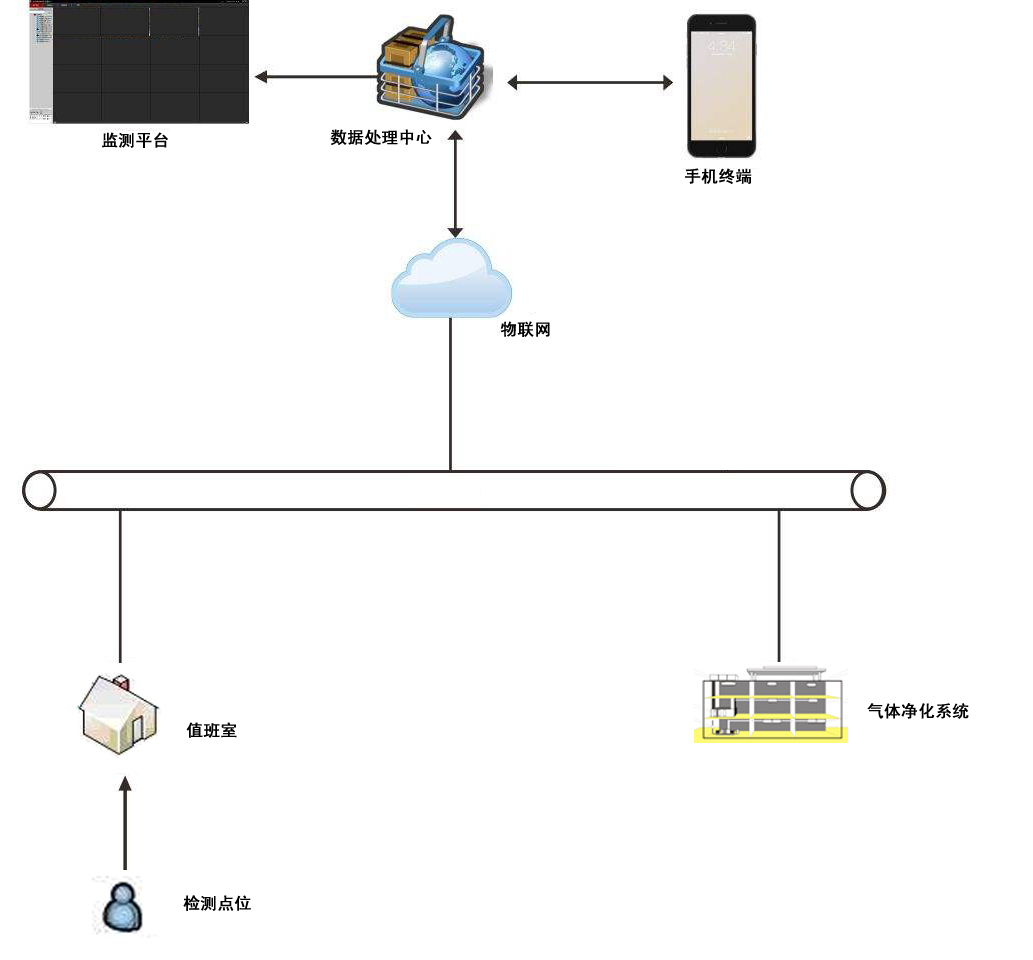 本系統(tǒng)主要由手套箱點位檢測、廠房集中監(jiān)測,中心控制室集中監(jiān)測三部分組成(如圖所示)