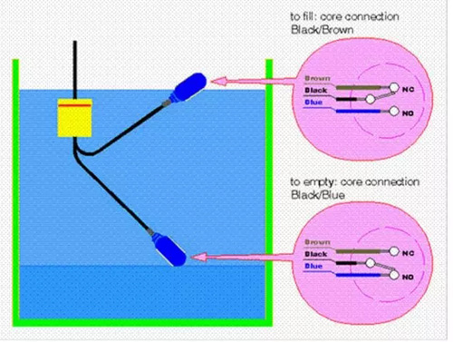 使用棕色和藍色的電線:浮球在上液位時,接點是接通的狀態(tài)。浮球在下液位時,接點是不通的狀態(tài)。
