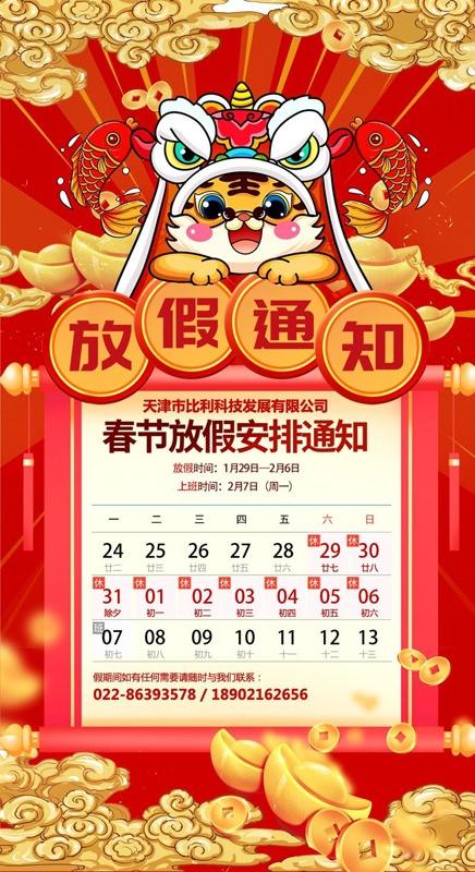 在此,感謝大家在過(guò)去一年里對(duì)比利科技的支持與信任。同時(shí)也希望在新的一年里,比利能繼續(xù)得到大家的關(guān)注及支持,并且比利也會(huì)一如既往地為大家提供更優(yōu)質(zhì)的服務(wù)!正值中國(guó)的傳統(tǒng)節(jié)日“春節(jié)”來(lái)臨,在此向各位新老客戶和廣大朋友們拜個(gè)早年!預(yù)祝大家新春愉快!財(cái)源廣進(jìn)!事業(yè)紅火!
